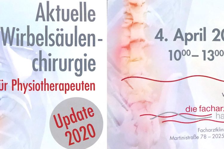 14.02.2020 – Anmeldung Update 2020 Aktuelle Wirbelsäulenchirurgie für Physiotherapeuten   Interessierte Physiotherapeuten können sich ab sofort für die Fortbildung Aktuelle Wirbelsäulenchirurgie für Physiotherapeuten – Update 2020 am 4. April 2020 in der Facharztklinik Hamburg von 10.00 bis 13.00 Uhr anmelden. Prof. PD Dr. Jörg Ohnsorge – Leiter der Orthopädischen Praxis und Wirbelsäulenzentrum ohnsorge spine service…